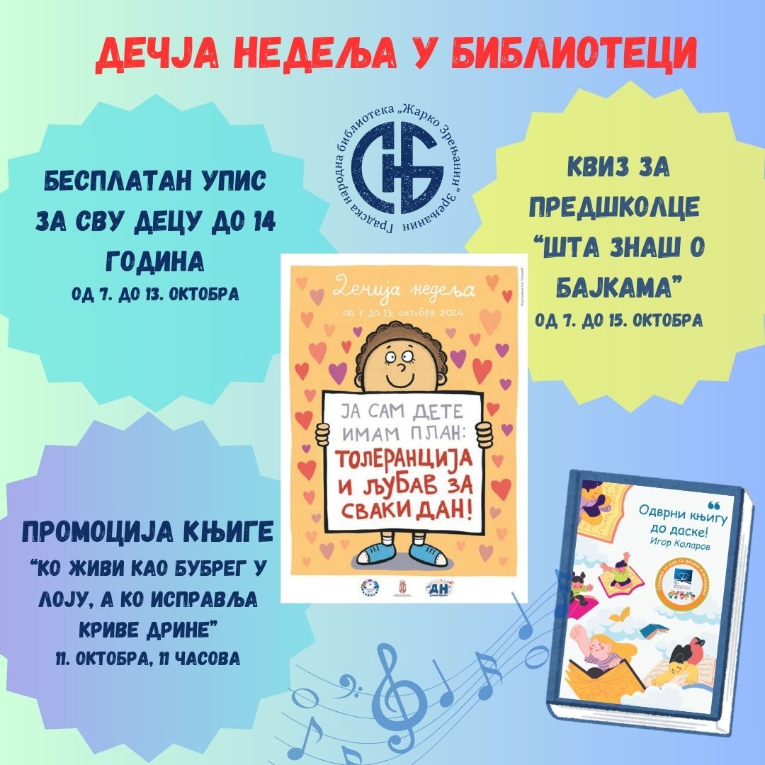 Gradska narodna biblioteka "Žarko Zrenjanin" povodom Dečje nedelje organizuje besplatan upis na Dečje odeljenje za svu decu do 14 godina, kao i zanimljiv program.