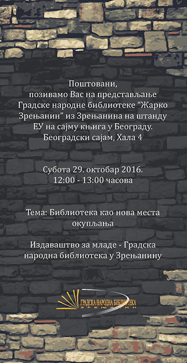 - U subotu, 29. oktobra, na poziv Narodne biblioteke Srbije, Gradska narodna biblioteka "Žarko Zrenjanin" predstaviće se na štandu Evropske unije (hala 4) u okviru programa "Bilioteke kao nova mesta okupljanja" i "Izdavaštvo za mlade" od 12 do 13 časova.